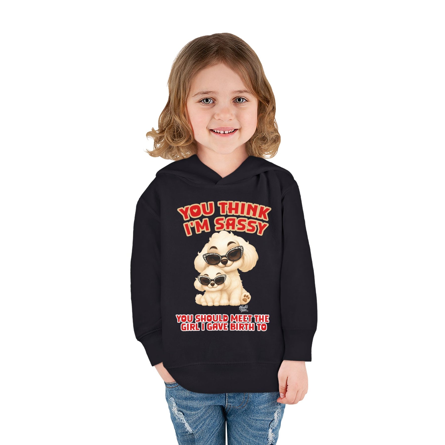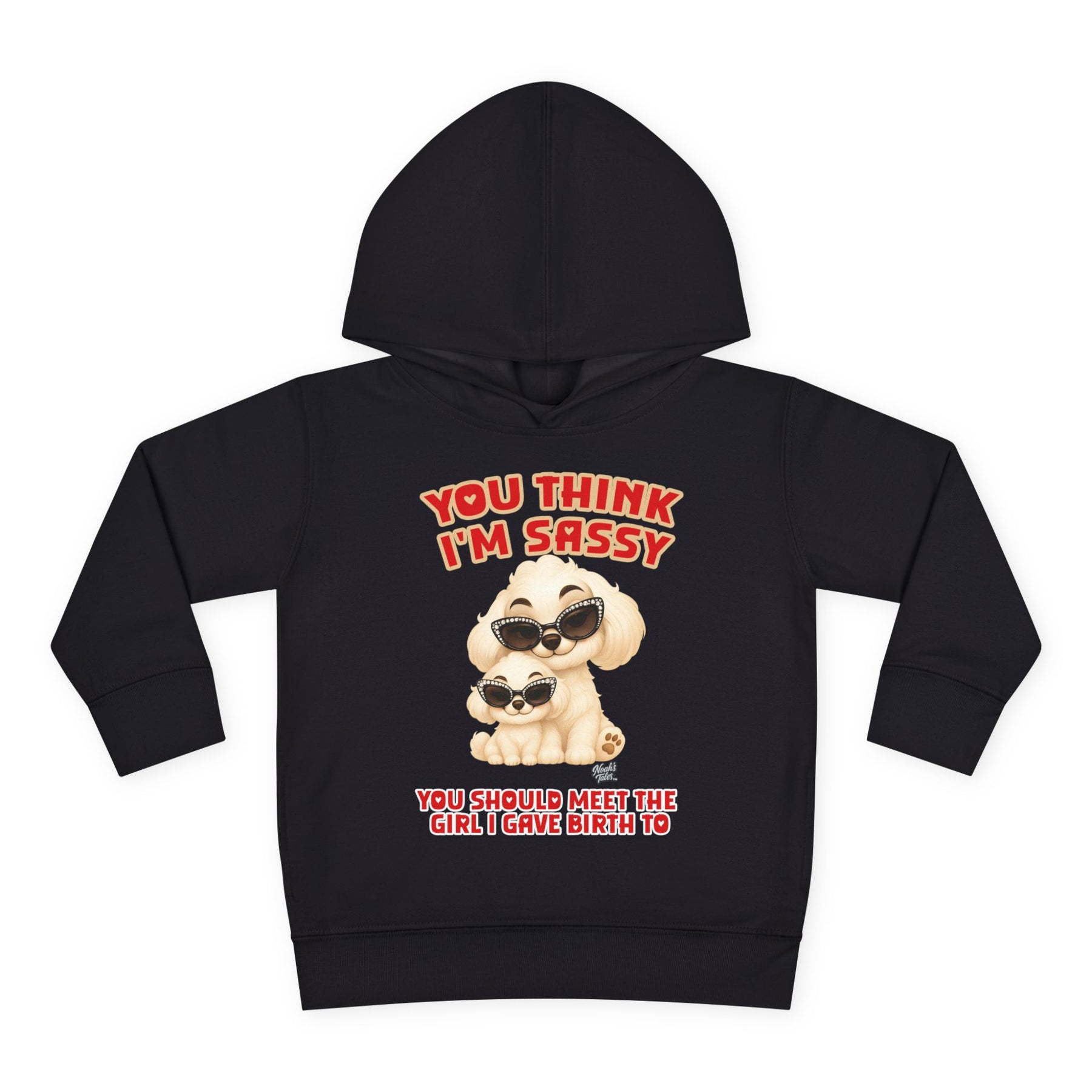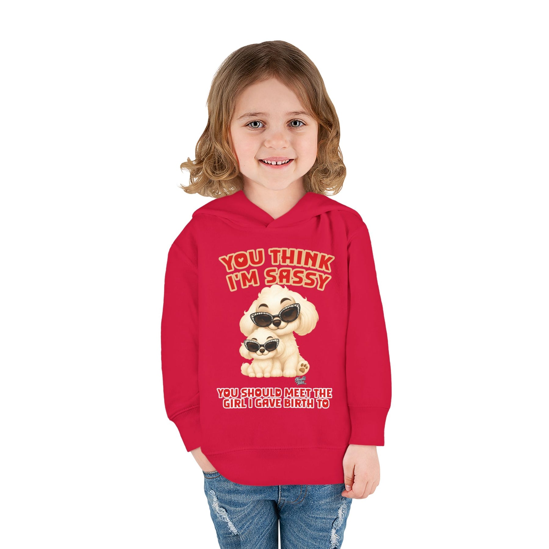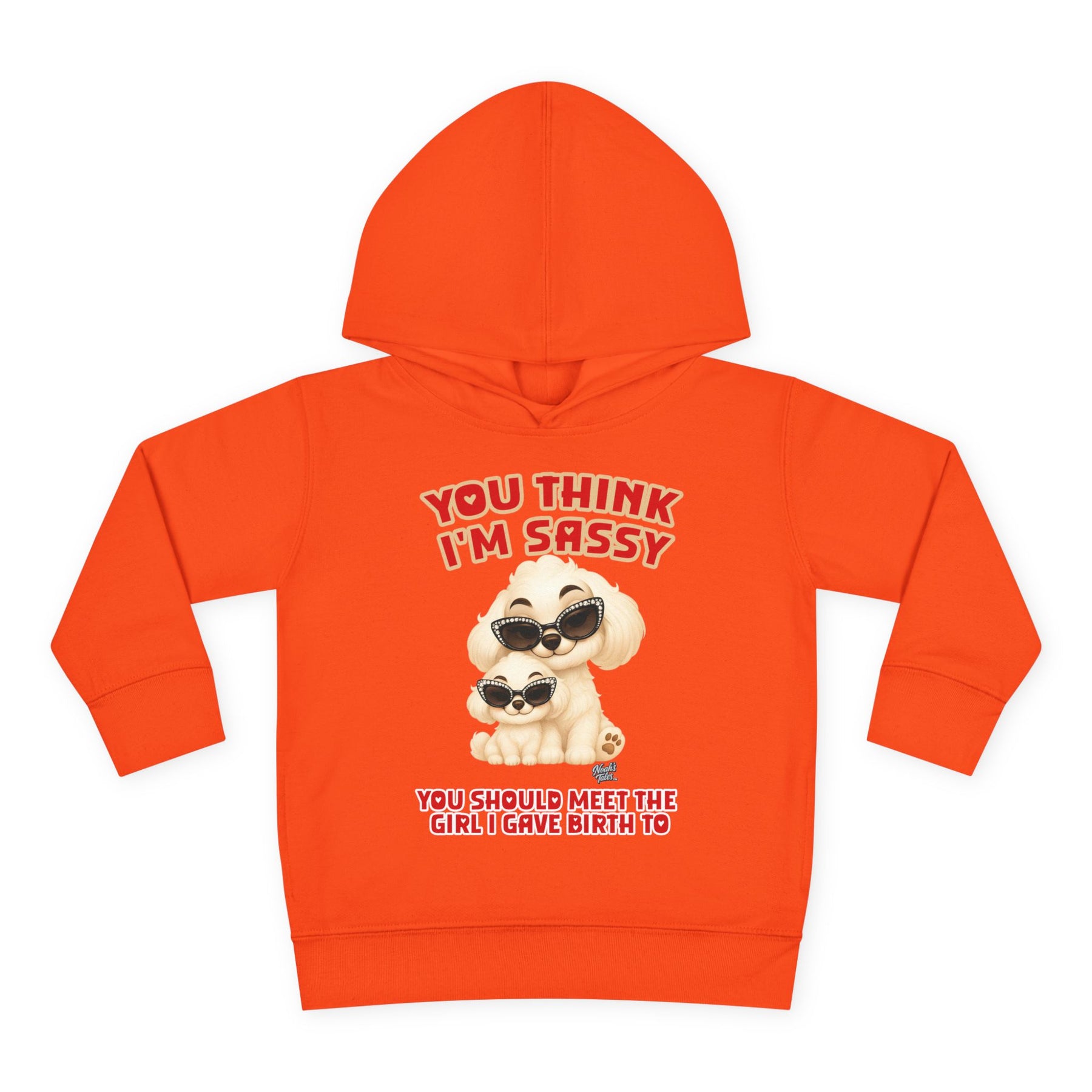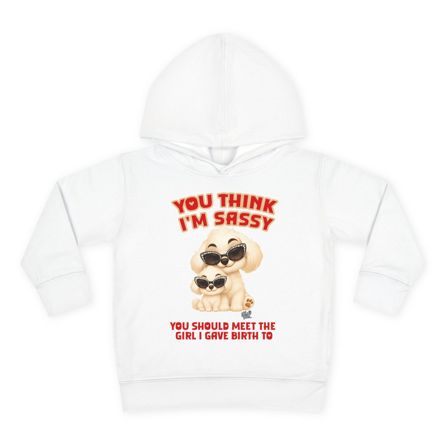 Soft, cozy hoodie made for little ones who love to stand out. The front shows a playful, sassy baby dog wearing sunglasses with bold, cheerful lettering that reads: “You think I’m sassy — you should meet the girl I gave birth to.” Lightweight but warm, the fleece interior and jersey-lined hood cradle small shoulders while side pockets keep tiny hands warm or hold a small snack. Durable coverstitching and ribbed cuffs keep the shape through washes and play. This hoodie slips into everyday routines — layered over tees for chilly playground runs, brought along for family photo days, or worn during relaxed weekend mornings at home. It’s a fun, confident piece that sparks smiles and matches spirited little personalities.